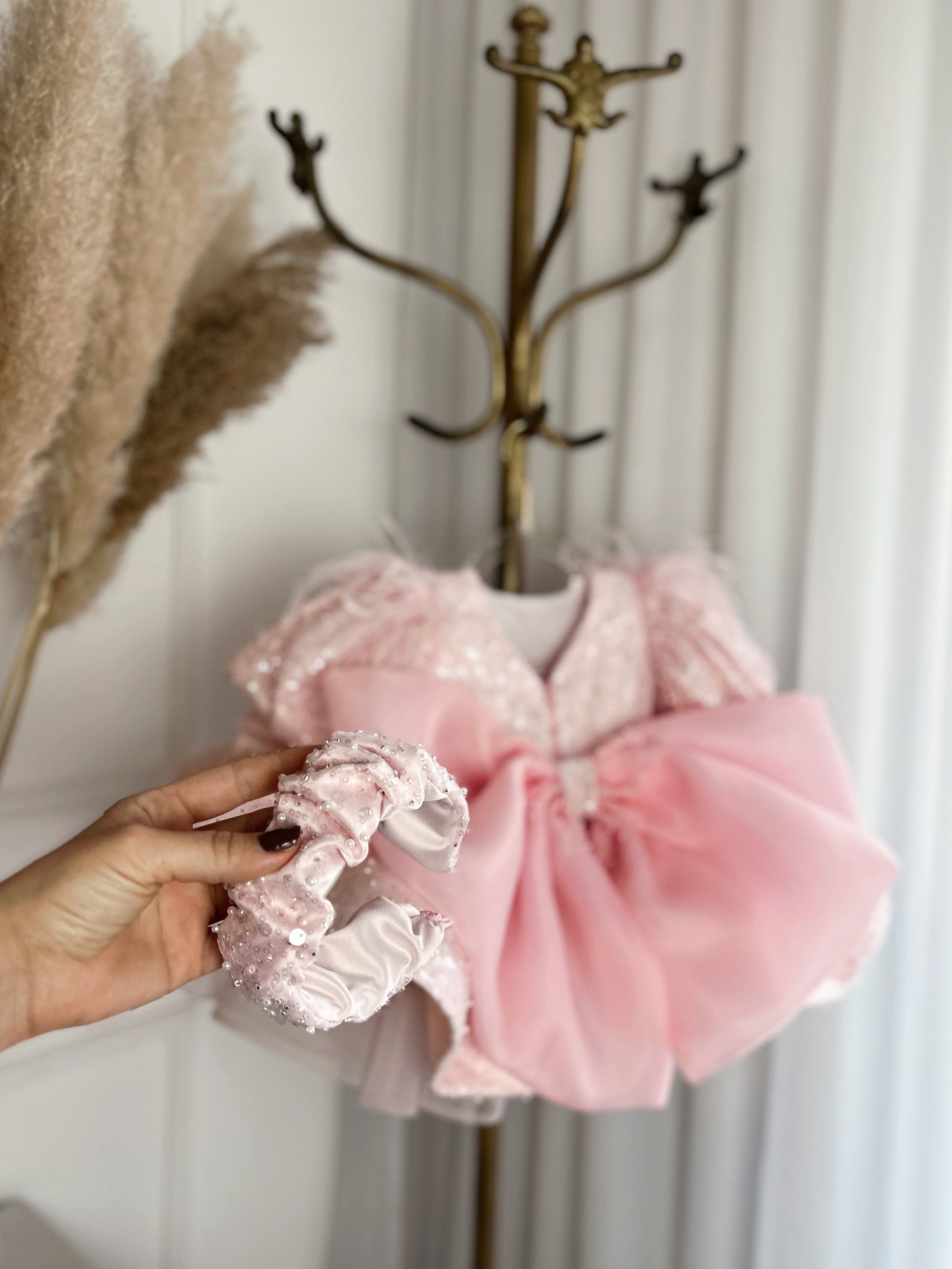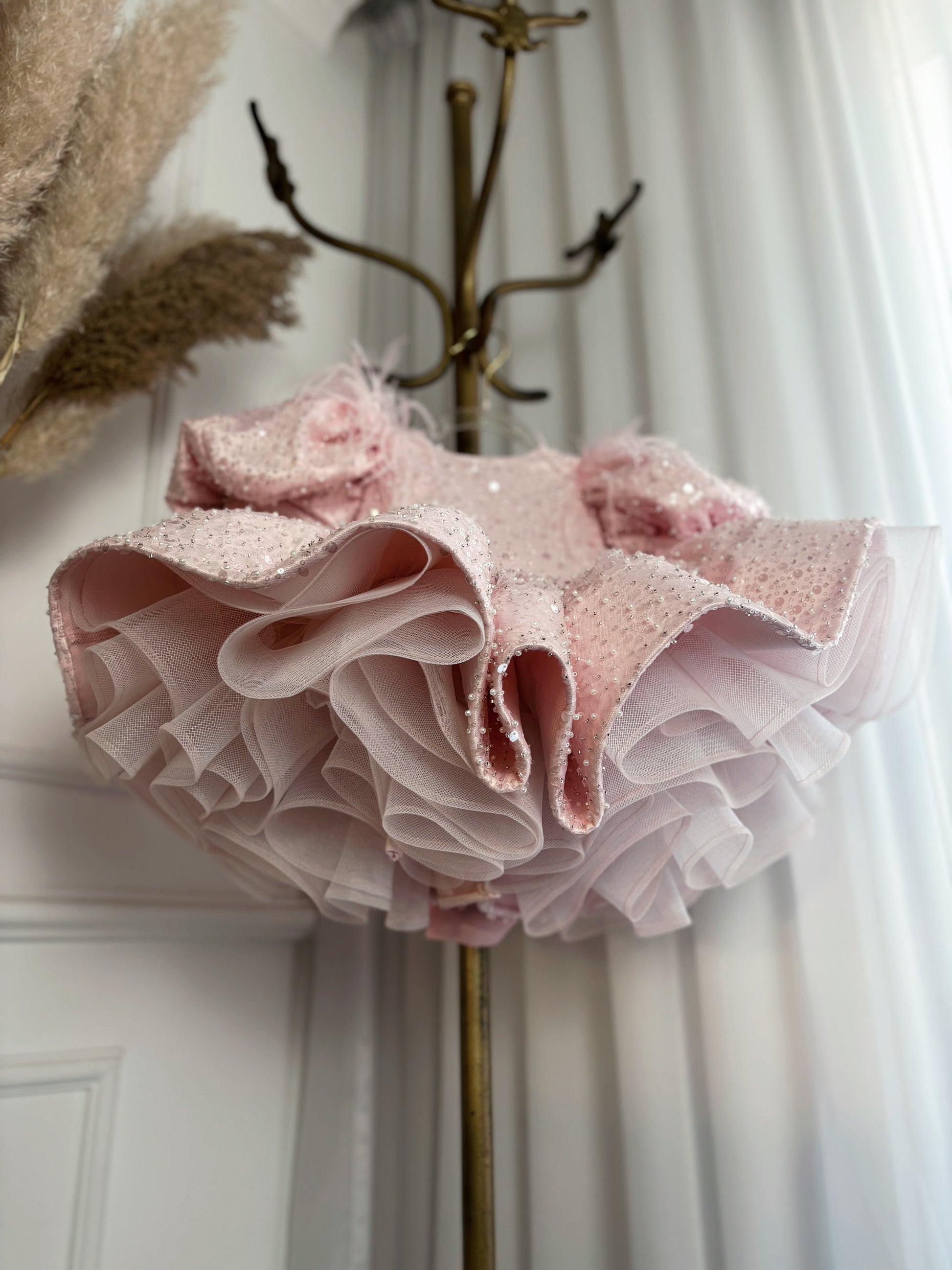 Posebnu čar haljini daju puf rukavi ukrašeni finim nojevim perjem, koji unose notu visoke mode i bajkovite elegancije. Svaki detalj je pažljivo promišljen kako bi haljina bila podjednako vizuelno impresivna i udobna za nošenje, uz mekanu postavu prilagođenu dečjoj koži.