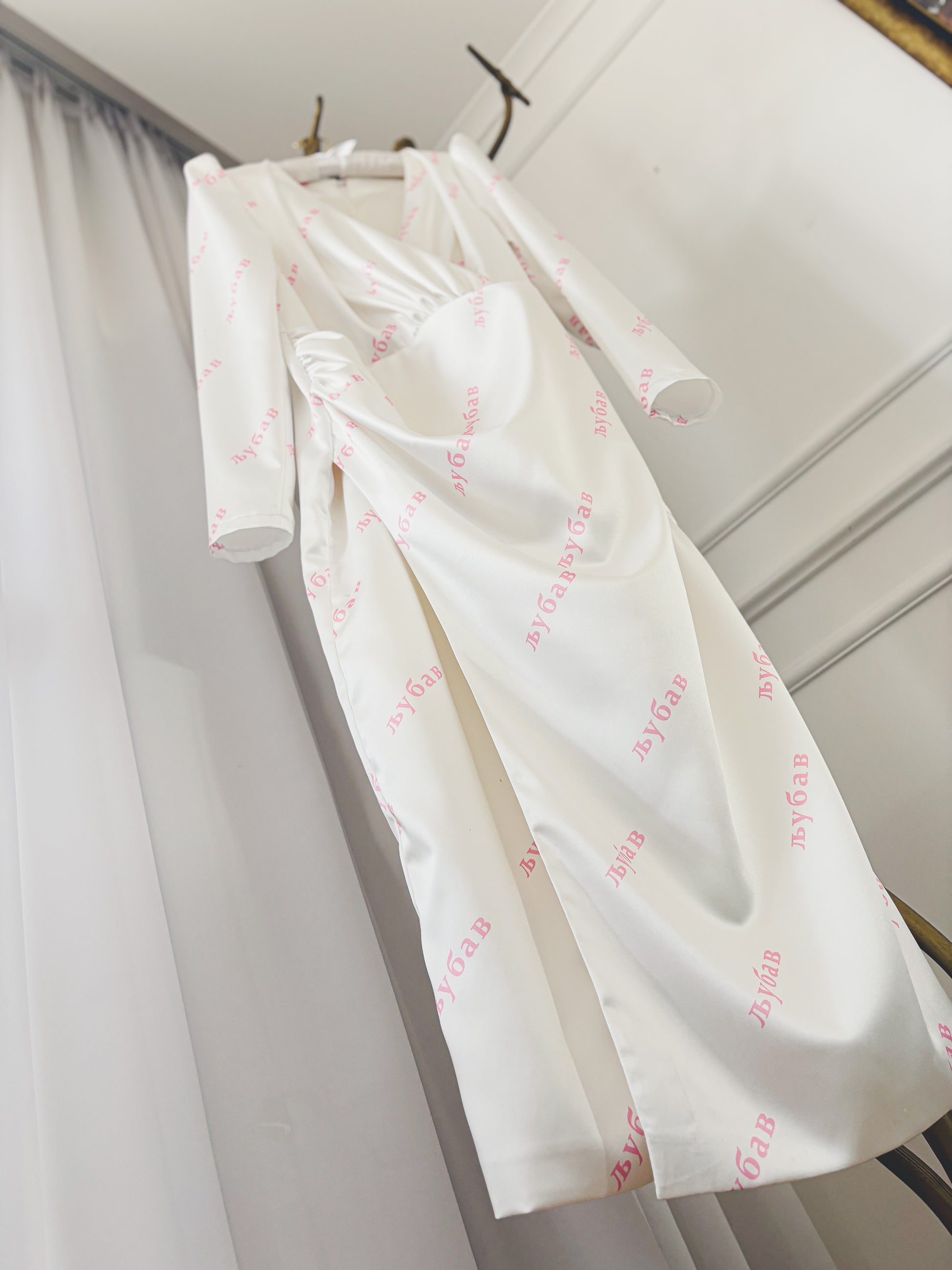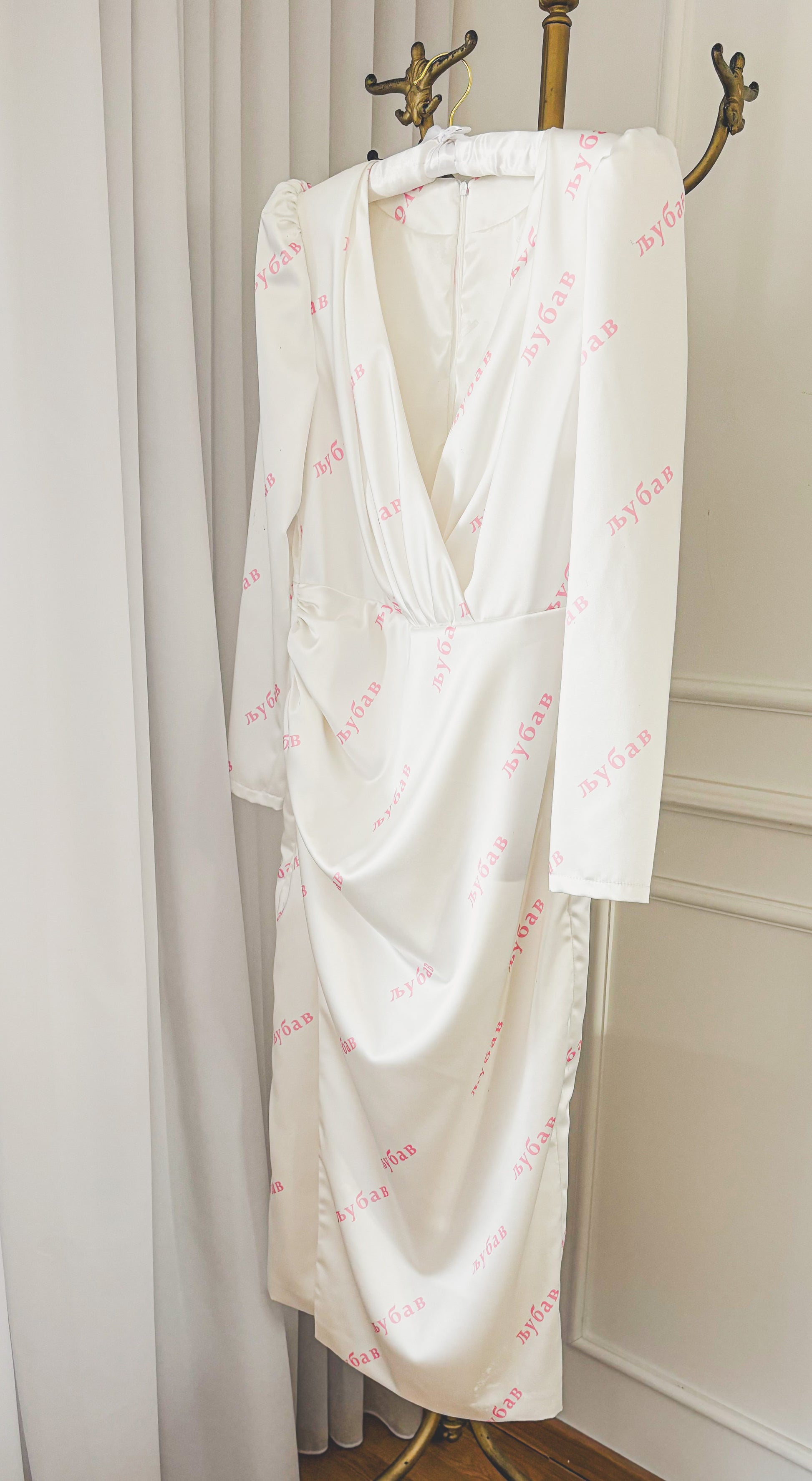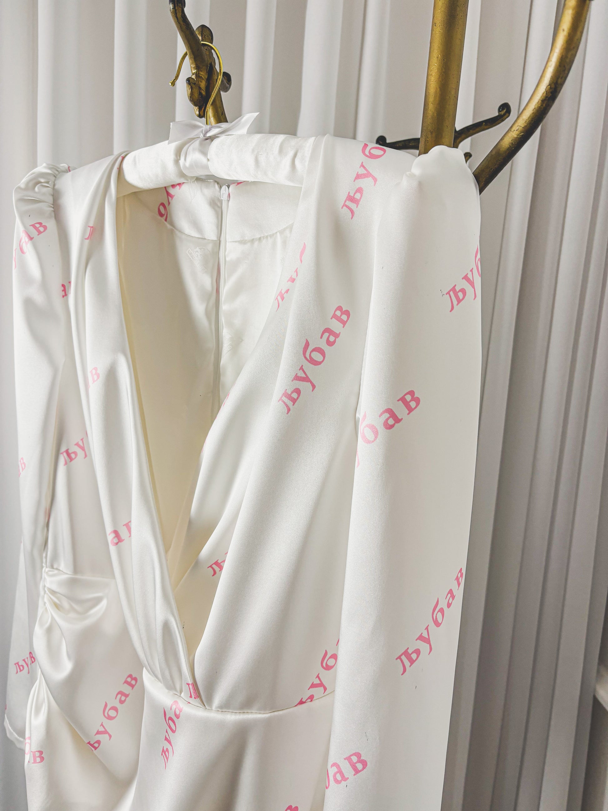 The MARILYN dress is a tight satin dress with rich pleats that highlights the virtues and hides the flaws. The top and bottom are foldable. The neckline is V-shaped and the lower part is an asymmetric skirt, gathered at the side seam. The hem of the dress is asymmetrical. It is lined with viscose throughout.